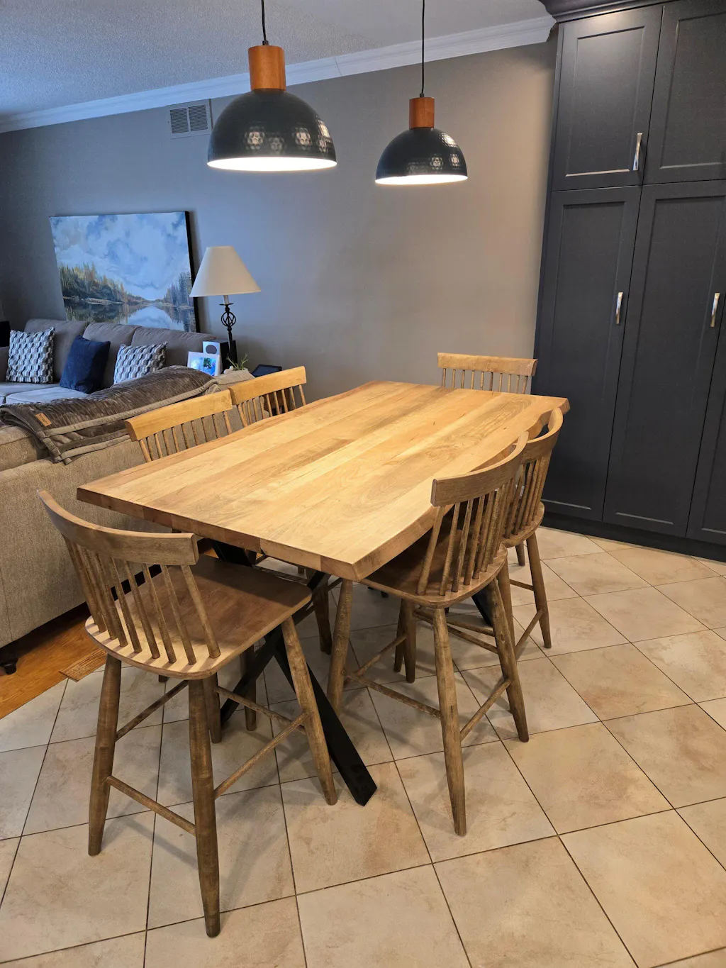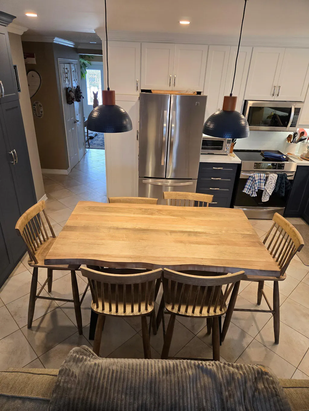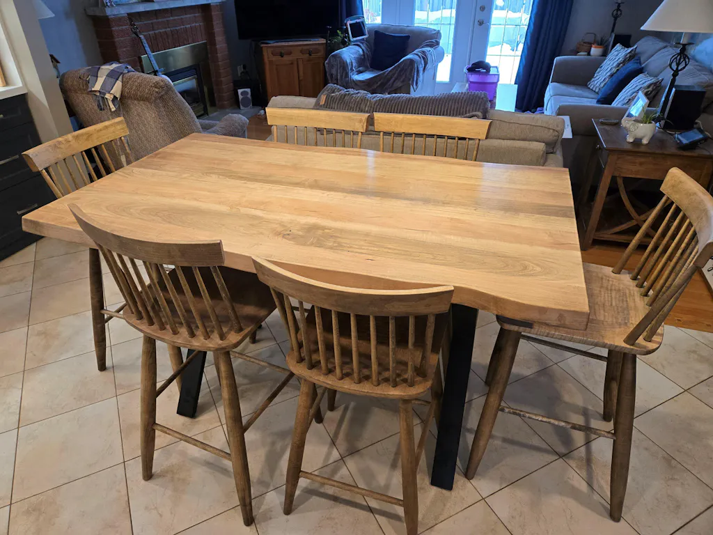 We just completed a kitchen reno and we wanted a special table as a centrepiece. We live in Whitby and started looking here for hand-made tables and chairs, and we ended up at Fractal Designs in Belmont. Brad was terrific from the get-go. He was knowledgeable and listened closely to what we were asking. He was never pushy. We saw several beautiful tables in the showroom, and one caught our eye - a wormy maple (simply a description, not a negative :) ) with Mennonite-made chairs. And the price was excellent. The set was ready when he said it would be, so I rented a cargo van and Brad and co. packed up the furniture with the moving blankets I brought and sent me home. The pictures tell the tale. We have a stunning, counter-height table witha curved edge that fits in perfectly. Response from all those who have seen it has been enthusiastic. Thank you so much, Brad and Fractal Designs. We recommend you highly. If you have someone in our area who wants to see your work first-hand, let us know.
